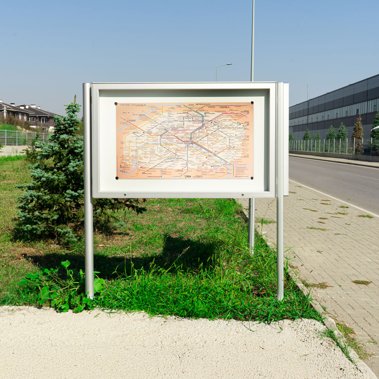 Freestanding Notice Board is a tough outdoor bulletin board with exceptional design and standards. With silver anodised aluminium profiles and an extra heavy hinged door with a dumper mechanism, the freestanding notice board is durable. On the other hand, it is produced compatible with Ingress Protection (IP) 56 standards, which means water from heavy seas or water projected from jets shall not enter the machine in any harmful quantity. You can use it outside for many years. Hinge is fixed in the case, and the corners are secure. 4 mm. tempered glass is impact-resistant.