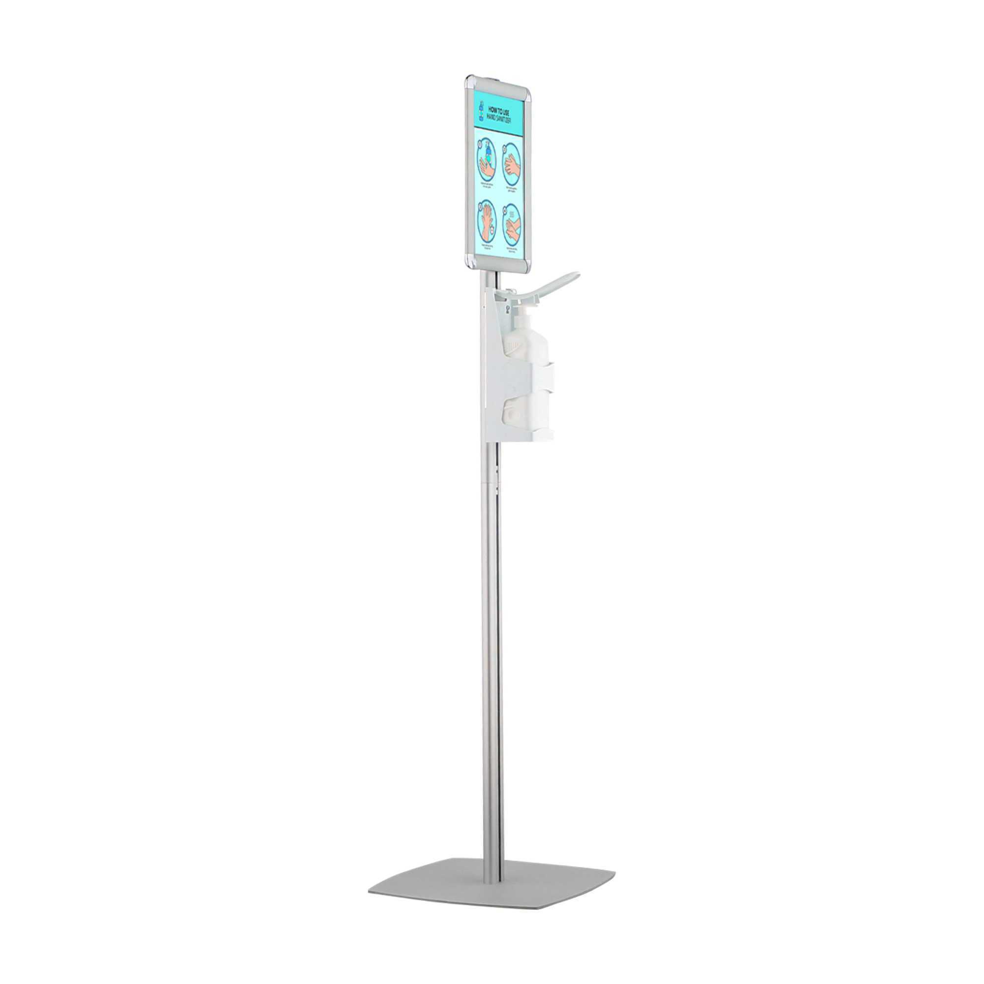 Manuel Sanitizer Holder Stand is a freestanding arm lever dispenser suitable for adding a snap frame and brochure holders.