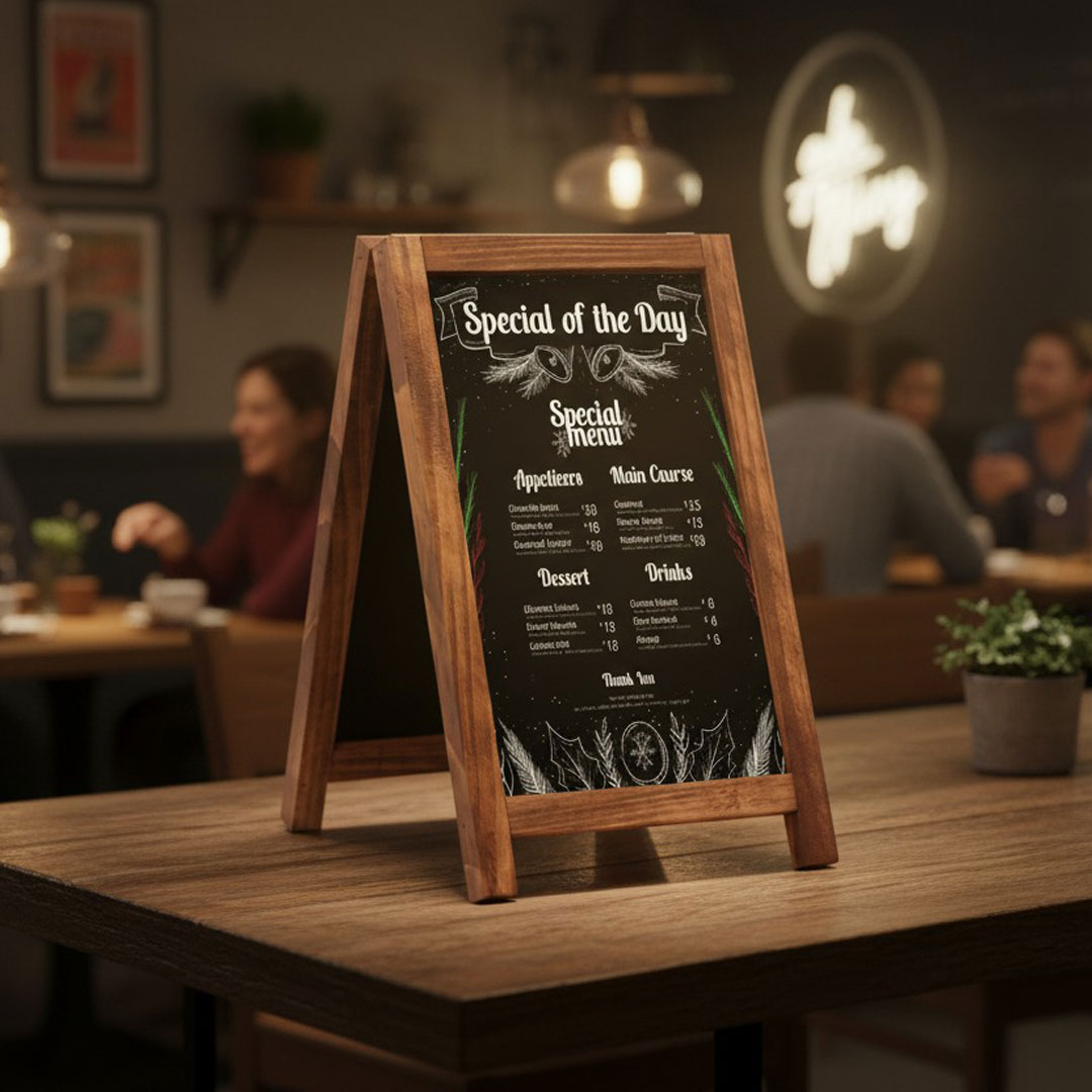 The ORES Mini Chalk A-Board is the perfect tabletop display solution for businesses in the HORECA (Hotels, Restaurants, Cafes) sector. Compact, stylish, and functional, it’s designed to elevate your menu and promotional displays with elegance and practicality.